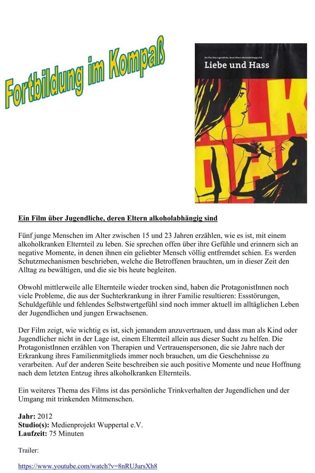 Fortbildung im Kompaß: Ein Film über Jugendliche, deren Eltern alkoholabhängig sind