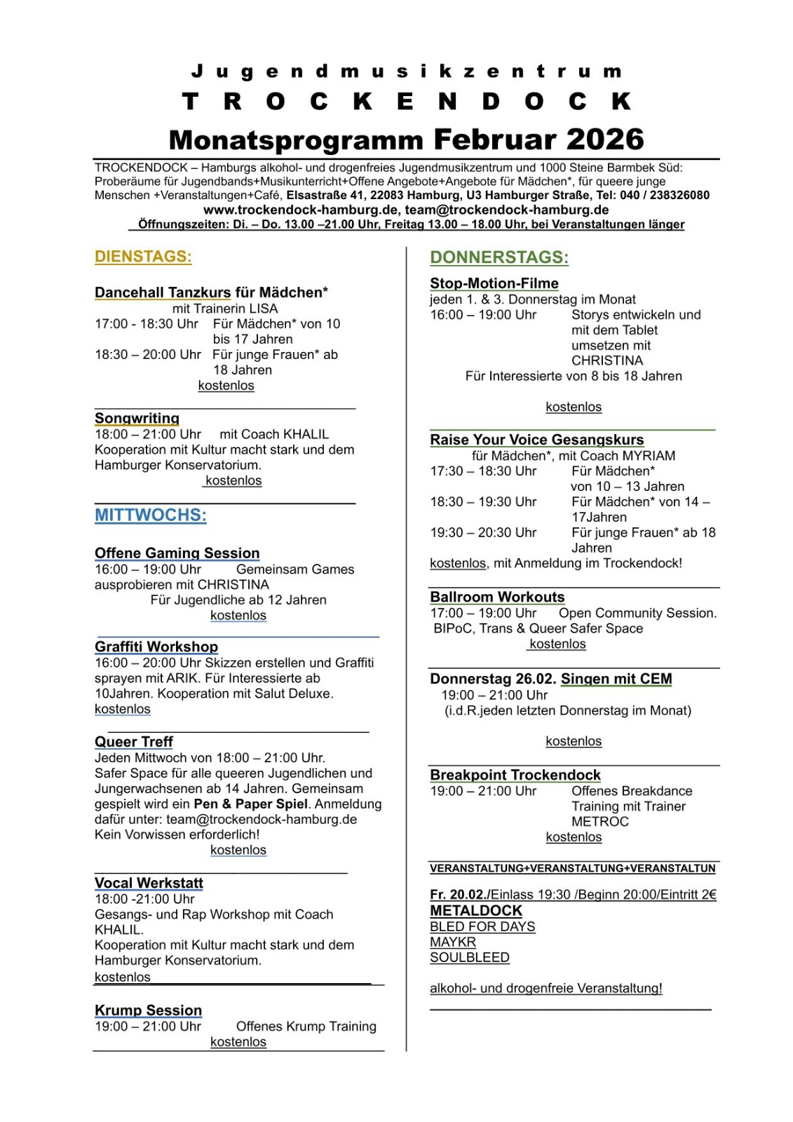 The "Trockendock" is an addiction prevention project in which you can develop your passion freely. You only need your creativity for this. Everyone is welcome with us, whether you are just starting out or already advanced. We are also happy to help you with advice or assistance in situations that have nothing to do with music.