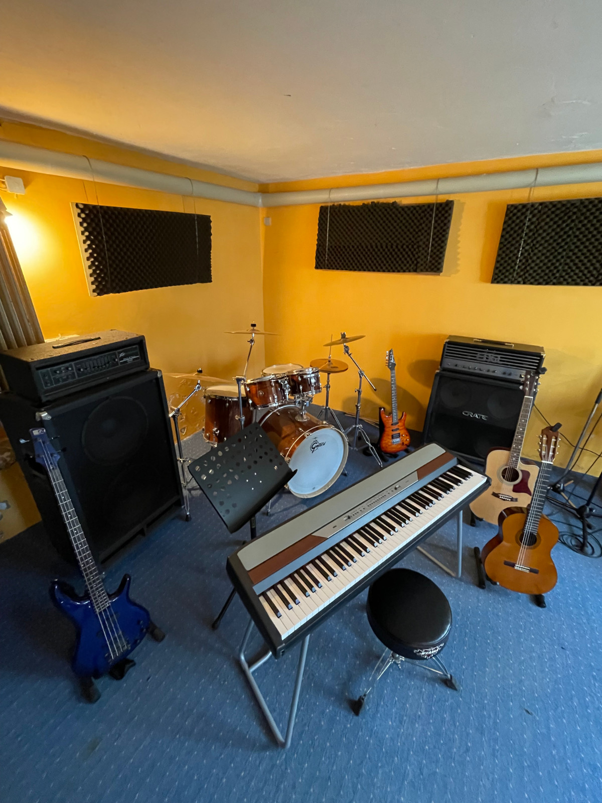 WIR bieten 3 komplett ausgestattete Übungsräume, 1 Tonstudio, Unterricht für Gitarre, Schlagzeug und Rap - und bei Bedarf Beratung in musikalischen und sonstigen Fragen.