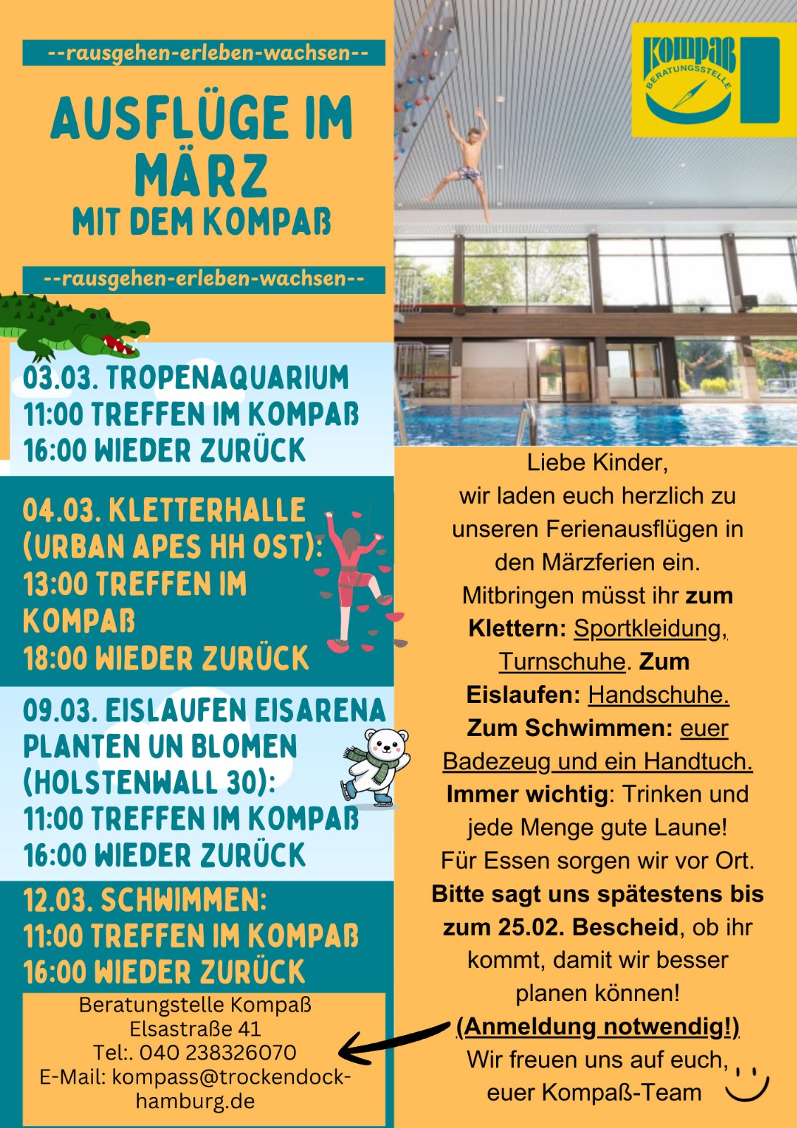 Liebe Kinder, wir laden euch herzlich zu unseren Ferienausflügen in den Märzferien ein. 03.: Tropenaquarium, 04.: Kletterhalle, 09.: Eislaufen, 12.: Schwimmen